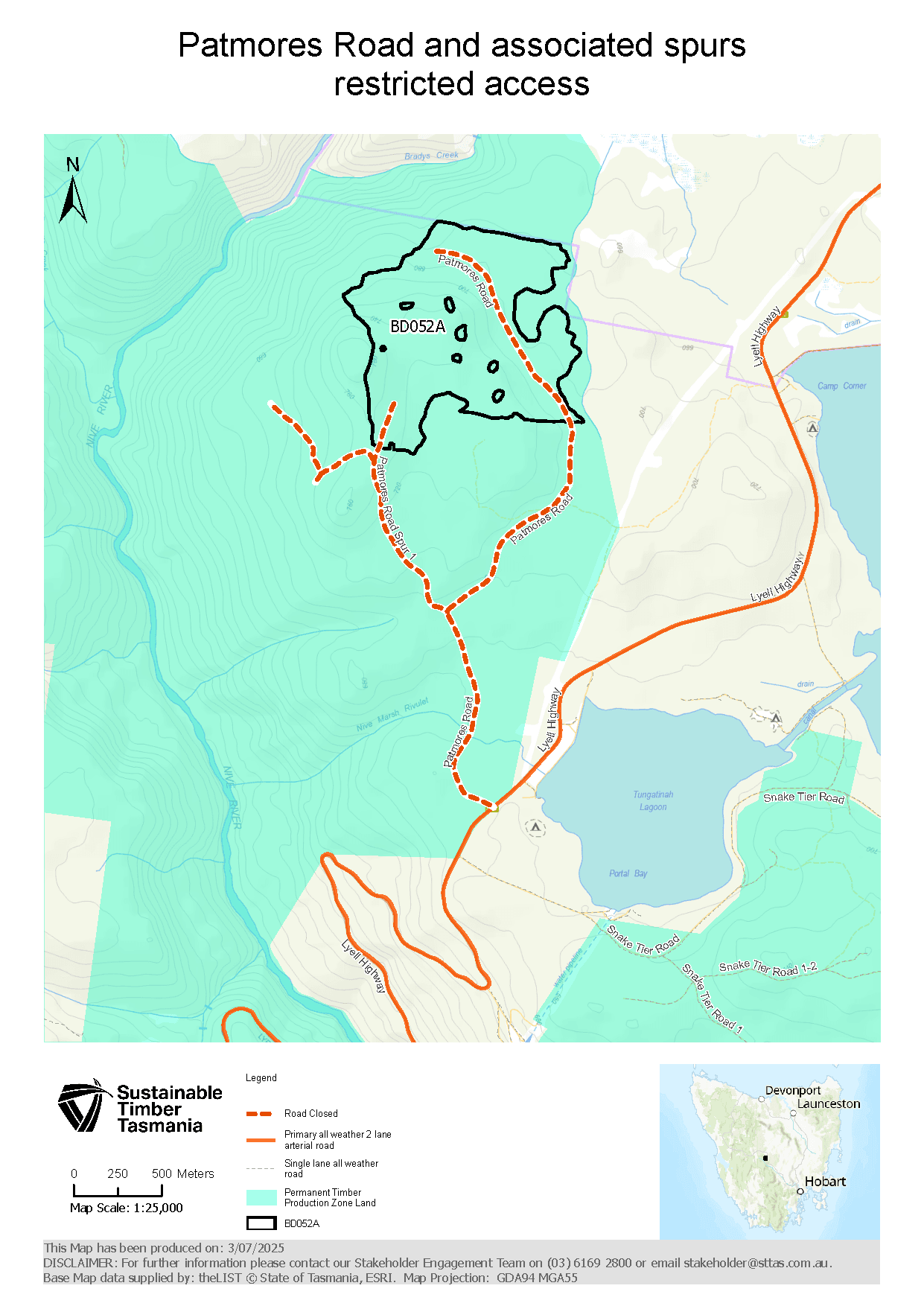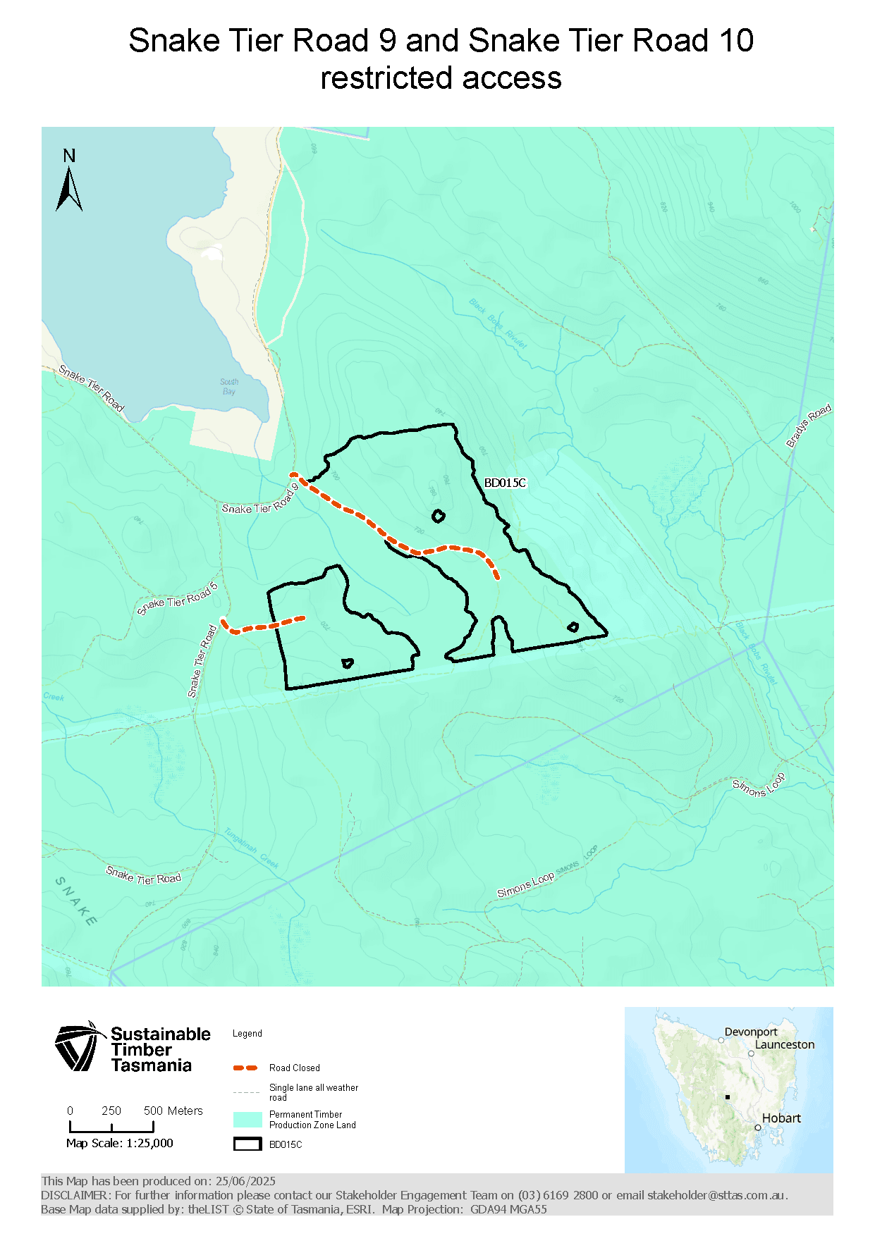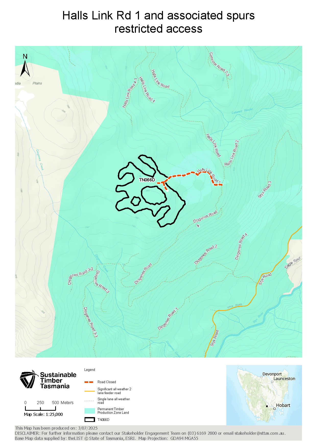 The roads will be closed to all vehicular traffic for the duration of the operation, excluding traffic authorised by Sustainable Timber Tasmania until 30th June 2025.
