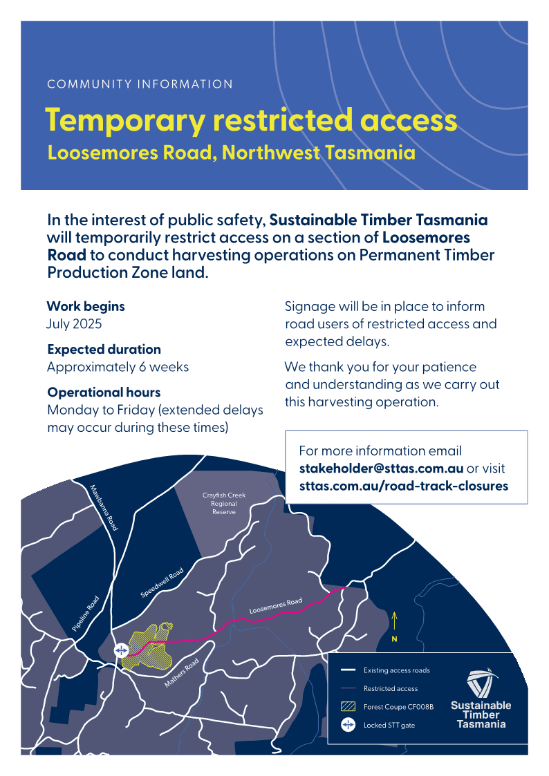 In the interest of public safety, Sustainable Timber Tasmania will temporarily restrict access on a section of Loosemores Road to conduct harvesting operations on Permanent Timber Production Zone land.
