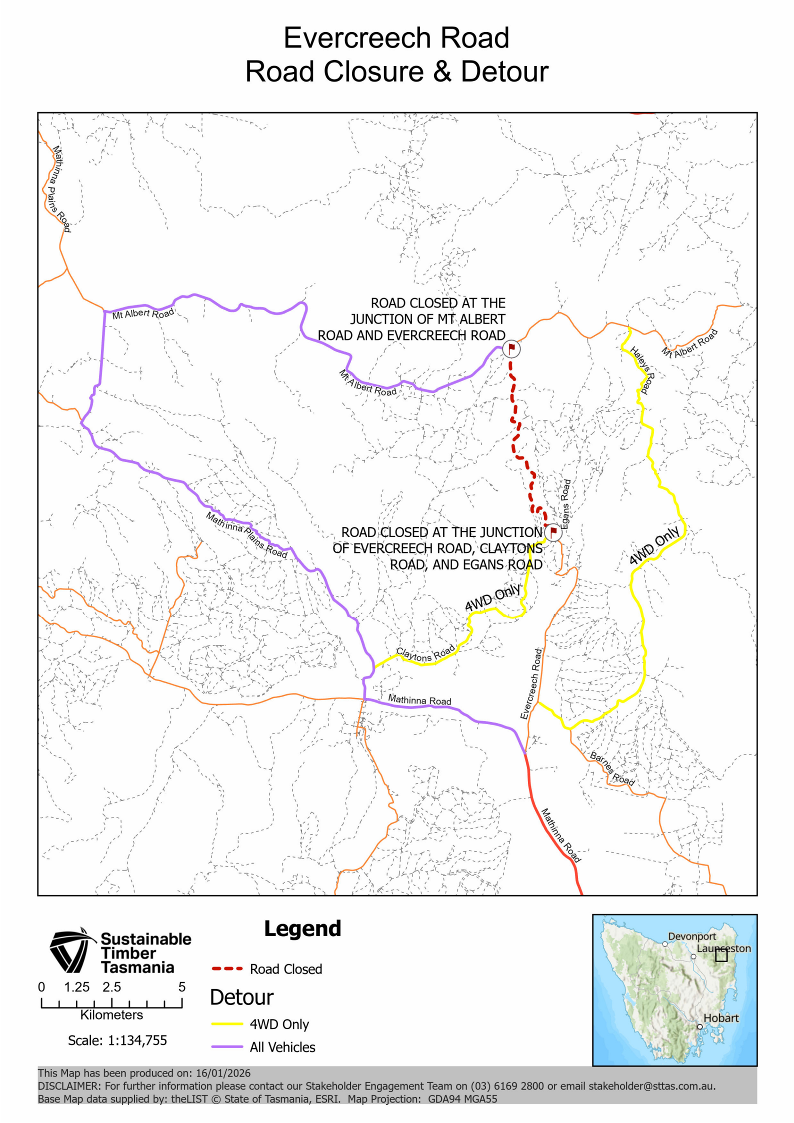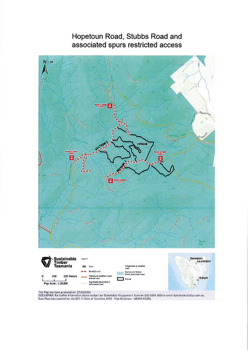 The roads will be closed to all vehicular traffic for the duration of the operation, excluding traffic authorised by Sustainable Timber Tasmania.