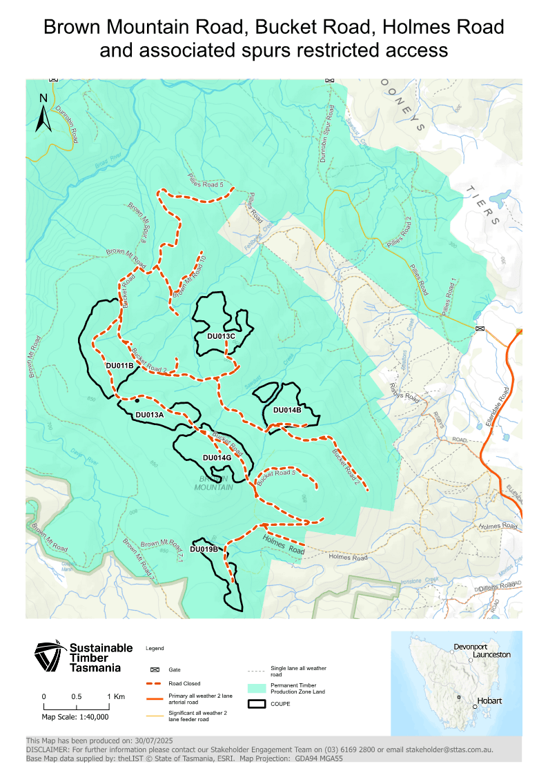 The roads will be closed to all vehicular traffic for the duration of the operation, excluding traffic authorised by Sustainable Timber Tasmania.