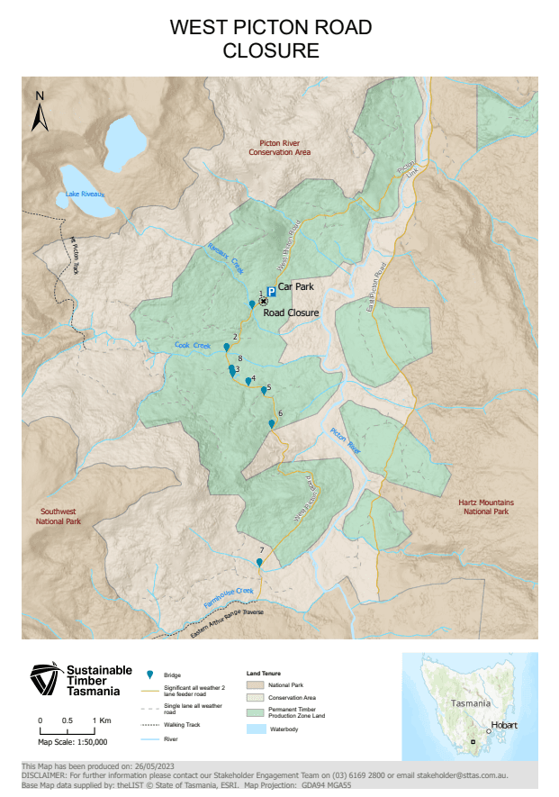 The Eastern Arthur Range Traverse (Farmhouse Creek Track) will remain open to bushwalkers with the development of a vehicle turn around and car parking bay at the junction of the West Picton Road closure location (just prior to Cooks Creek) provided by Tasmania Parks and Wildlife Service and Sustainable Timber Tasmania.